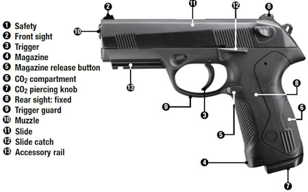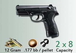 The Umarex PX4 Storm Blowback air pistol is a replica of the Beretta PX4 Storm firearm. This 16-shot repeater will have you shooting as fast as you can pull the trigger. There's an 8-shot rotary clip on one end of the stick magazine and another one at the other end. After you're done shooting the first clip, flip the magazine for the rest of the shots. Since it shoots BBs or pellets, you'll have more flexibility with ammo choice. A 12-gram CO2 is easily loaded into the grip and gives you plenty of shots before you need a refill.