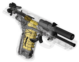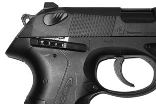Unlike the later generation Beretta 92/96/M9 series, the Px4's trigger guard is rounded for better concealed carry. The takedown pin of earlier models is replaced by a spring-loaded bar, accessed via frame recesses on both sides, which must be grasped and pulled down simultaneously to release the slide. The slide spring is doubly captive, being inserted approximately an inch into the transfer block at one end and a receiving hole in the front of the slide at the other. It is a self-contained assembly, completely captured by the polymer guide. The magazine holds the top round directly behind the barrel's breech end so only a slight feed ramp is needed.