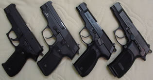 Operation: The slide and barrel are high strength steel and the frame is aluminum alloy. Available finishes are black matte, nickel, and a two-tone with a nickel finished slide and satin black frame. All the available finishing styles are non-reflective. The polymer grips are integrated "wraparound" style. The trigger is double-action for the first shot, single-action thereafter. The magazine is double stack and the slide remains open after the last round is fired. The magazine release button can be reversed for left-handed shooters and it has a "round in the chamber" indicator. It is one of the easiest, if not the easiest, semi-automatic handgun to field strip for cleaning.