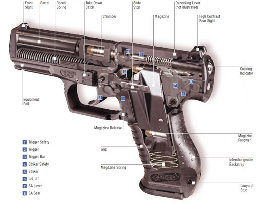 Second Generation Models: The Walther P99 is a short recoil-operated locked breech semi-automatic pistol that uses a modified Browning cam-lock system adapted from the Hi-Power pistol. The P99 has a glassfiber-reinforced polymer frame and steel slide assembly. It can be broken down into its main parts or field stripped with a take down catch without the help of tools.