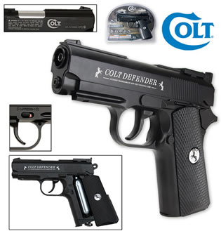 In true colt style: The Colt Defender BB Pistol has an ALL-METAL construction and a built in 16-shot BB magazine. The spring powered grip release and the CO2 compartment in the grip make this pistol extremely easy to operate. A fixed blade front sight makes aiming a breeze. Realistic weight of 1.6 lbs.