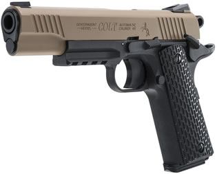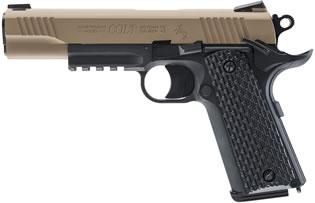 Like the Colt M45A1 CQBP issued to Marines as well as the commercial version, the Umarex Colt M45A1 CQBP features the flat, desert-tan-color on a metal slide. The frame is a polycarbonate substrate with black poly grips. You'll also notice the under-barrel Picatinny rail, 3-dot sights of which the rear is adjustable for windage, flat serrated mainspring with lanyard loop, enhanced Commander-style hammer, long, solid trigger, and ambidextrous safety lock.
