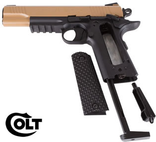 This 177 caliber air pistol with blowback action is a variation of the 1911 Rail Gun that's enlisted by the U.S. Marine Corps. The Colt M45A1 CQBP Air Pistol (Close Quarter Battle Pistol) by Umarex has a drop-free airgun magazine with a capacity of 19 rounds. Steel BBs are recommended for flawless function. They travel out of the smooth, metal barrel at a speed of 400 feet per second. The left grip plate removes for the loading of a 12 gram CO2 capsule and the mainspring slides out of the bottom of the grip frame to reveal a hex key for piercing the CO2 cartridge.