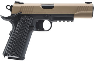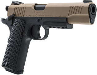The improved M45A1 CQBP features several changes to the original M1911A1 design. One feature is the dual recoil spring system that spreads out the recoil force of the .45 ACP round by lowering the peak force of the recoil pulse. It also has 3-dot tritium night sights, a 5-inch national match barrel, ambidextrous safety, picatinny rail, and a desert tan finish. The trigger pull comes in at 4.25 pounds. The overall weight of this airgun is 1.75 pounds.