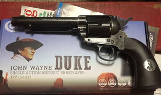 Featuring a full-metal frame, authentic action, and synthetic grips that have an inlay of John Wayne, this single shot BB revolver is CO2 powered and includes a 6-round cylinder with a working ejector rod. The 6-shot comes in various finishes and reveals the John Wayne signature on the back strap.