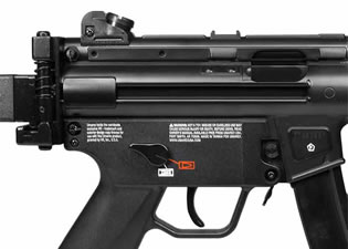 The MP5 has a hammer firing mechanism. The trigger group is housed inside an interchangeable polymer trigger module (with an integrated pistol grip) and equipped with a three-position fire mode selector that serves as the manual safety toggle. The "S" or Sicher position in white denotes weapon safe, "E" or Einzelfeuer in red represents single fire, and "F" or Feuersto� (also marked in red) designates continuous fire. The SEF symbols appear on both sides of the plastic trigger group.