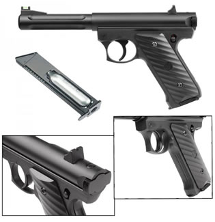 The Hatsan 250XT is a non-blowback replica air pistol that offers the realistic look and feel of a classic american handgun, perfect for both target shooting and plinking with new and well-versed shooters. The model 250XT looks just like a Ruger Mark IV .22 cal target pistol, right down to the disassembly lever on the backstrap the same as a Ruger Mark II firearm. This isn’t a licensed replica so you won’t find any Ruger markings here or any mention of the word Ruger on the box, packaging or on the replica itself.