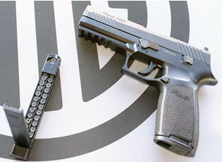 The SIG Sauer P320 is a semi-automatic pistol made by SIG Sauer of Exeter, New Hampshire and SIG Sauer of Eckernfrde, Germany. The SIG Sauer P320 can be chambered in 9x19mm Parabellum, .357 SIG, .40 S&W, and .45 ACP. The P320 chambered in 9x19mm Parabellum was introduced in the North American market on January 15, 2014 followed by the .45 ACP compact model at the SHOT Show in January 2015. The P320 is a further development of the SIG Sauer P250 utilizing a striker-fired mechanism in lieu of a double action only hammer system.